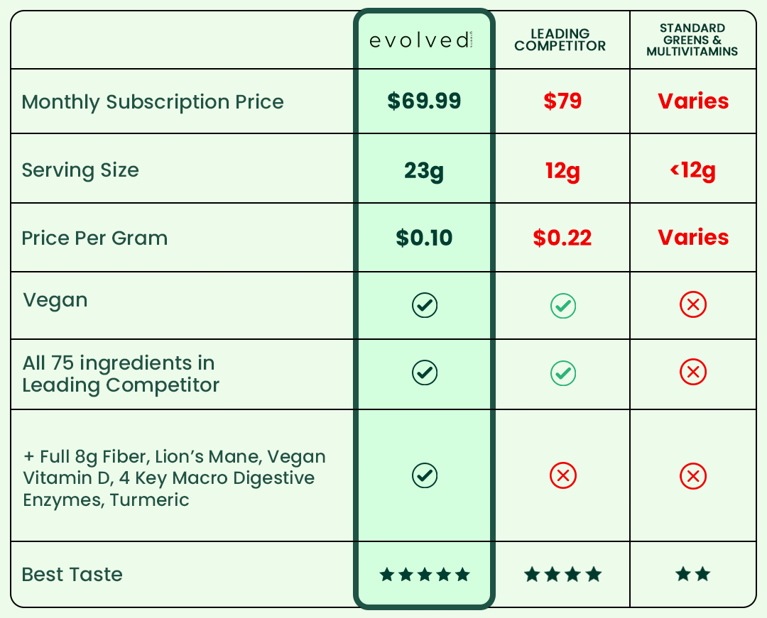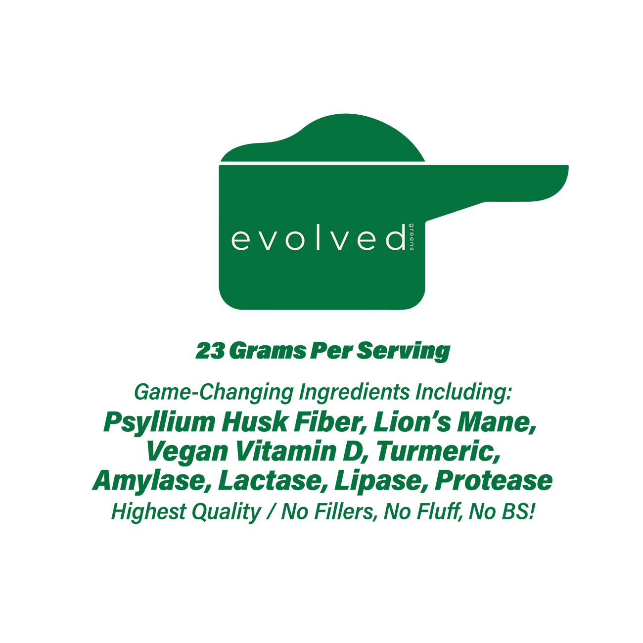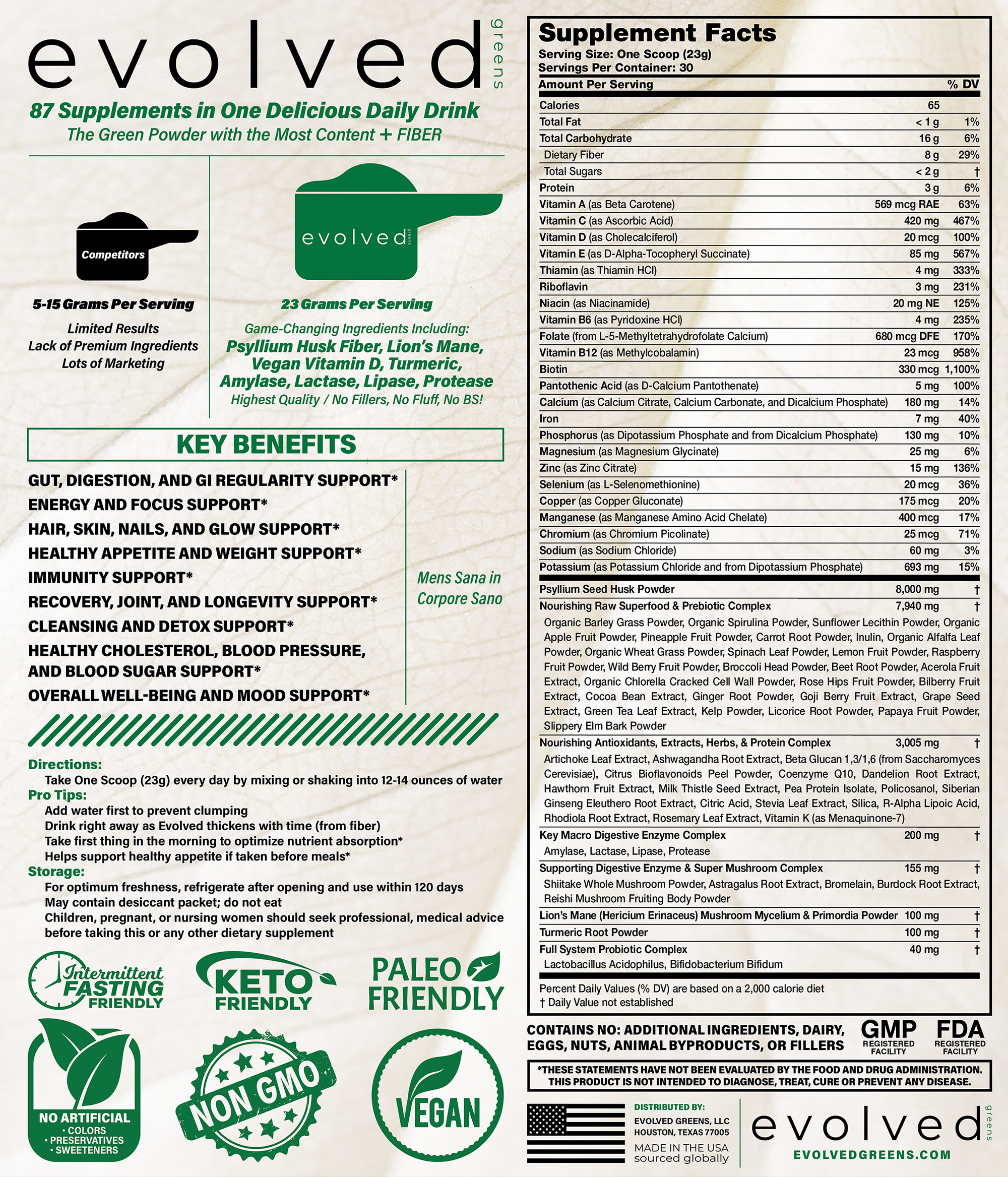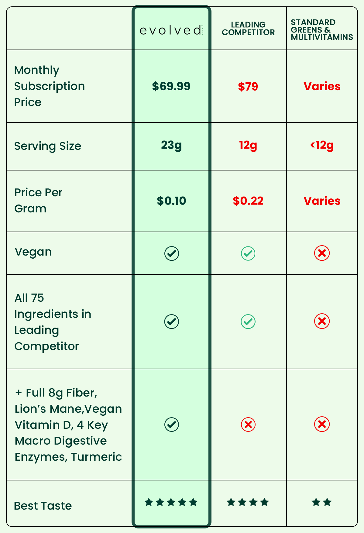 A decent multi-vitamin may contain 25 basic supplements - think of how small a vitamin pill is. Other super powders may contain ~75, but clearly prioritize cost over content, and are missing key ingredients like a full dose of fiber. Evolved is different: 87 supplements including the really good stuff like Psyllium Husk Fiber (transforms your digestion and restroom experience), Lion's Mane (game-changer for focus), Vegan Vitamin D ("miracle" vitamin for absorption, fatigue, and more), Turmeric (the inflammation killer), and Amylase, Lactase, Lipase, and Protease (get ready to digest like a teenager again)… with Evolved, you'll notice if you miss a day.